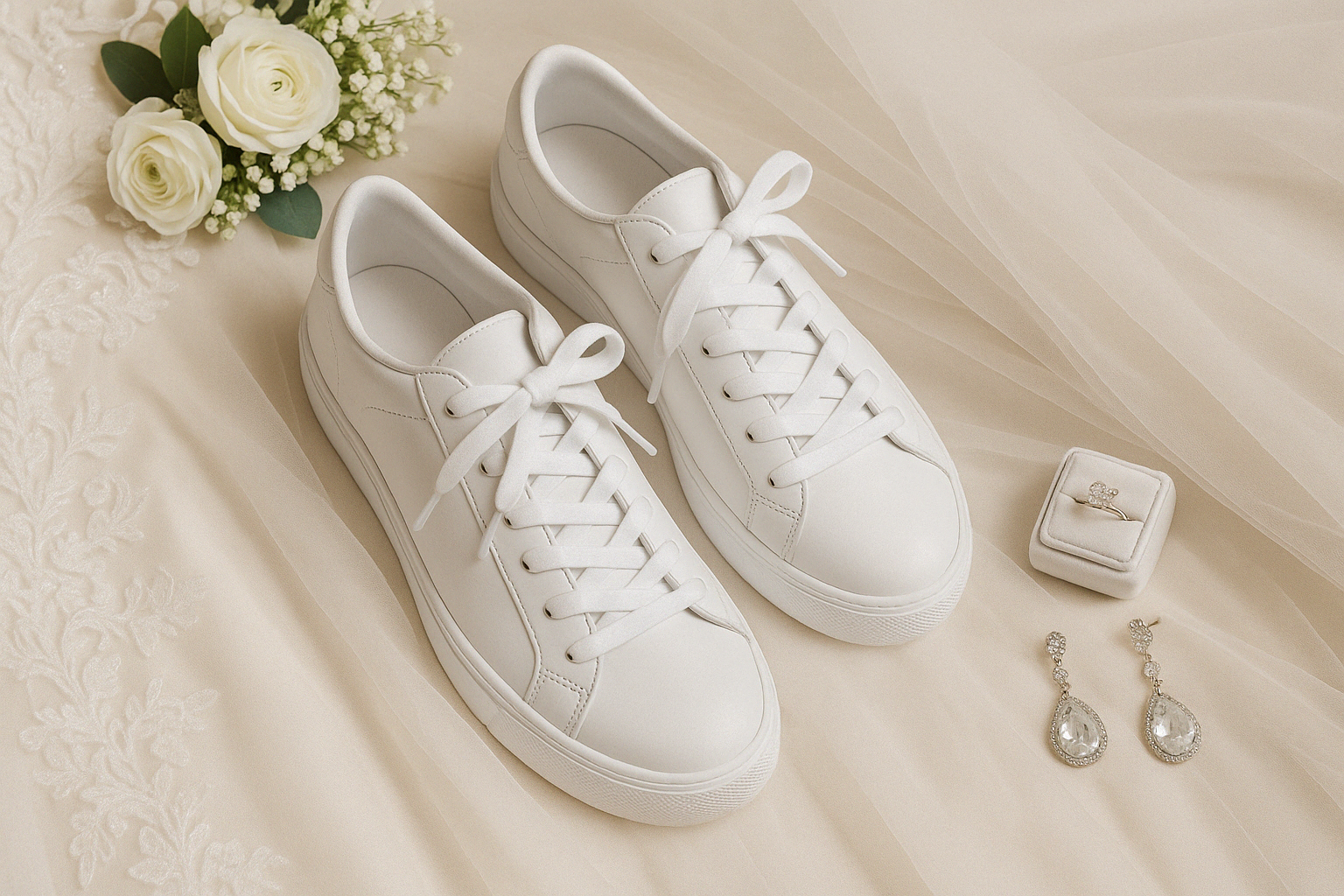 White sneakers are a comfortable and modern choice for brides, but if you’re worried they’ll look too plain for your wedding day, there’s a fix—and it’s all in the laces. Swapping out generic laces for something more expressive adds charm, individuality, and just the right dose of sparkle.